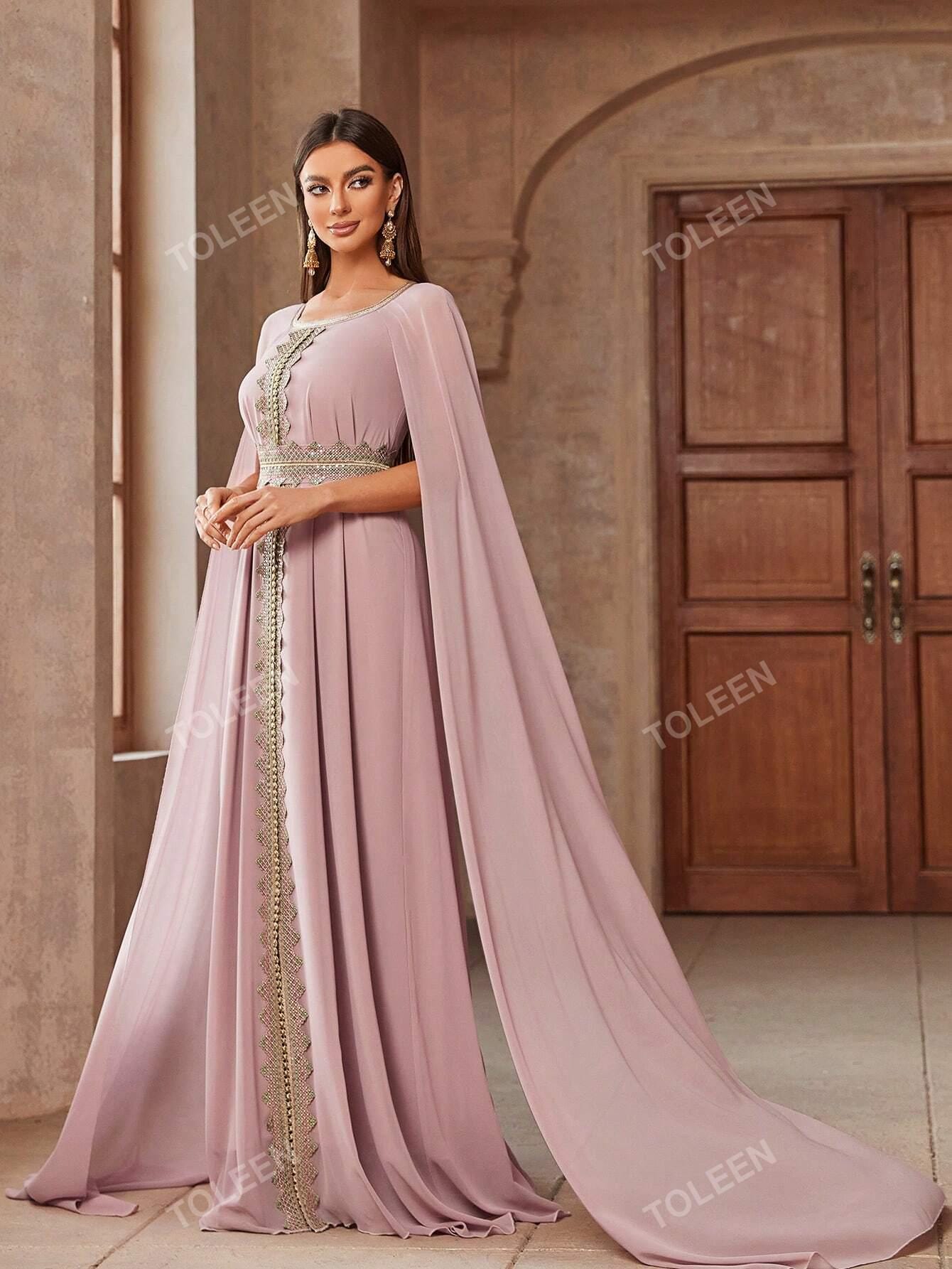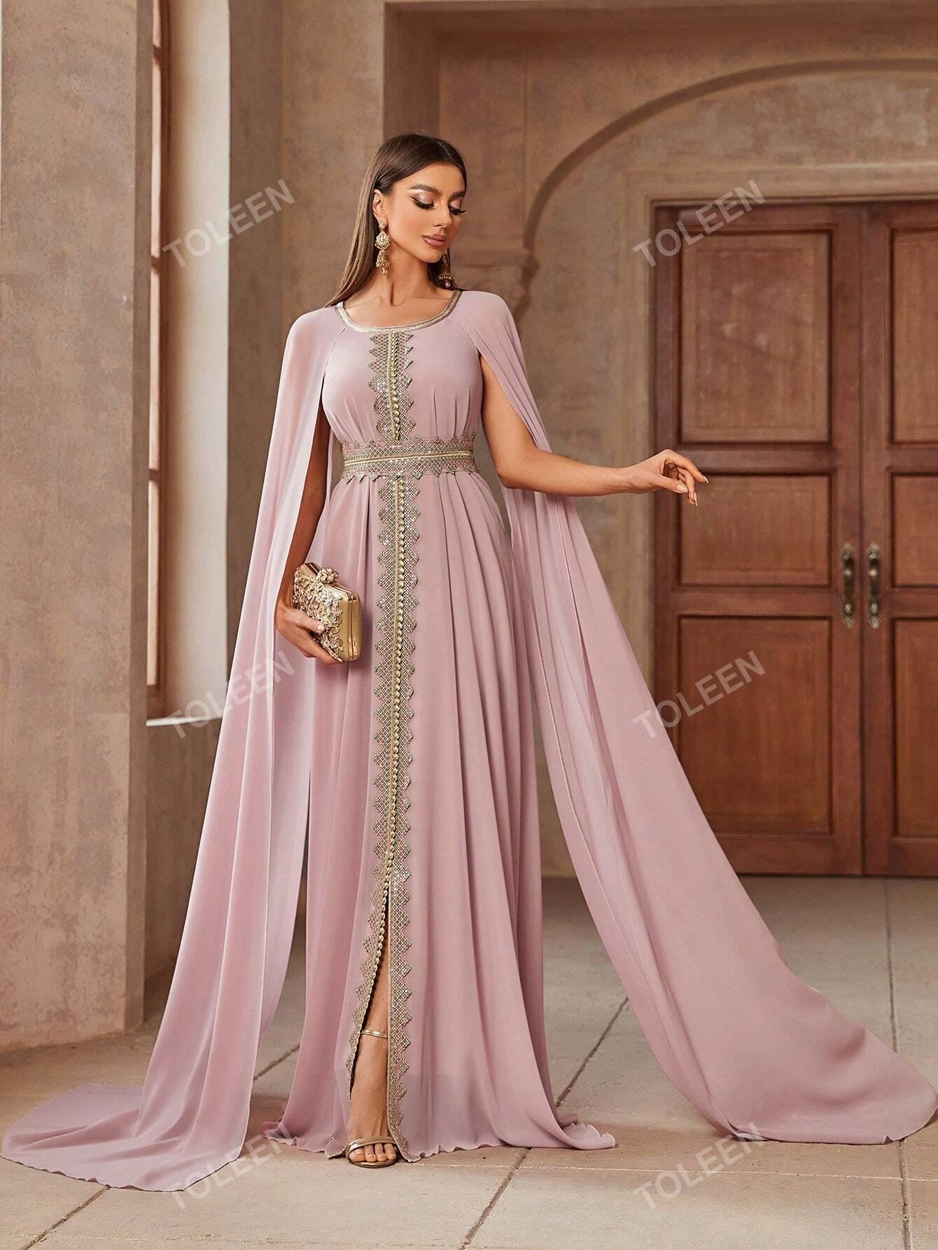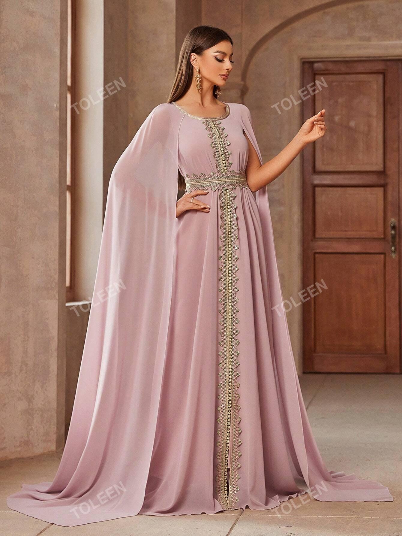 Type : A LineDetails : Appliques, Contrast Sequin, TapeSleeve Type : Cloak SleeveStyle : ElegantWaist Line : High WaistNeckline : Round NeckColor : PinkPattern Type : Colorblock, Plain, All Over PrintSleeve Length : Extra-Long SleeveLength : LongFit Type : Regular FitFabric : Non-StretchMaterial : Woven FabricComposition : 100% PolyesterCare Instructions : Hand wash,do not dry cleanPockets : NoSheer : No