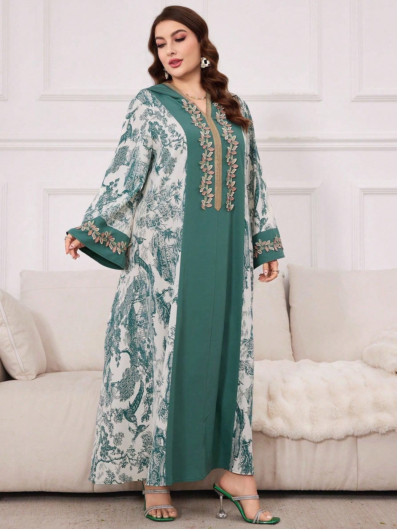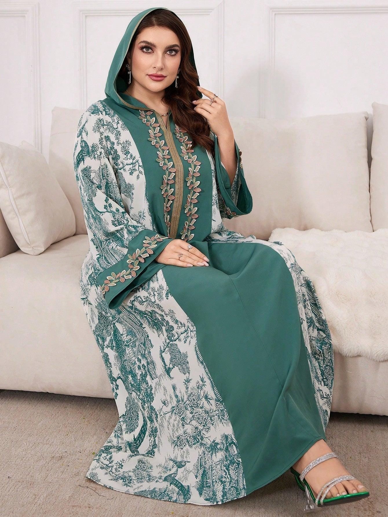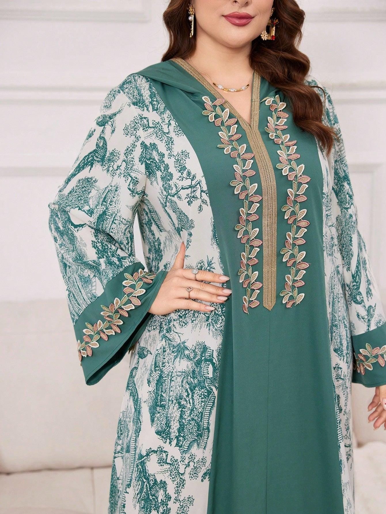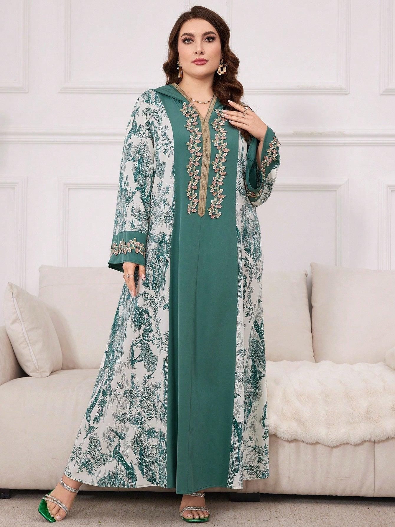 Plus Size Women Spring/Summer Arabian Dress With Plant Print, Patchwork & Drawstring Hood, Casual Long Sleeve Maxi Modest Dress