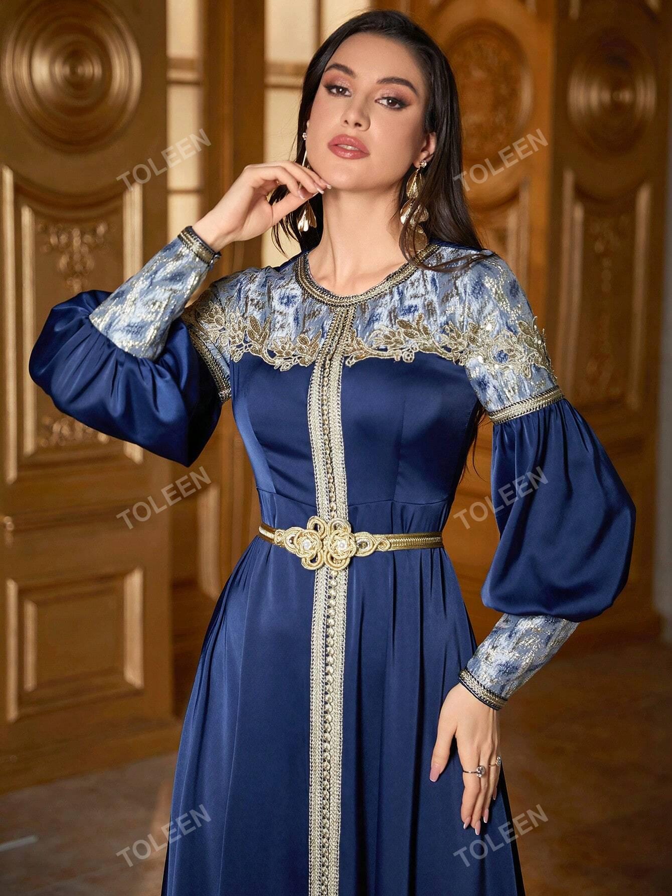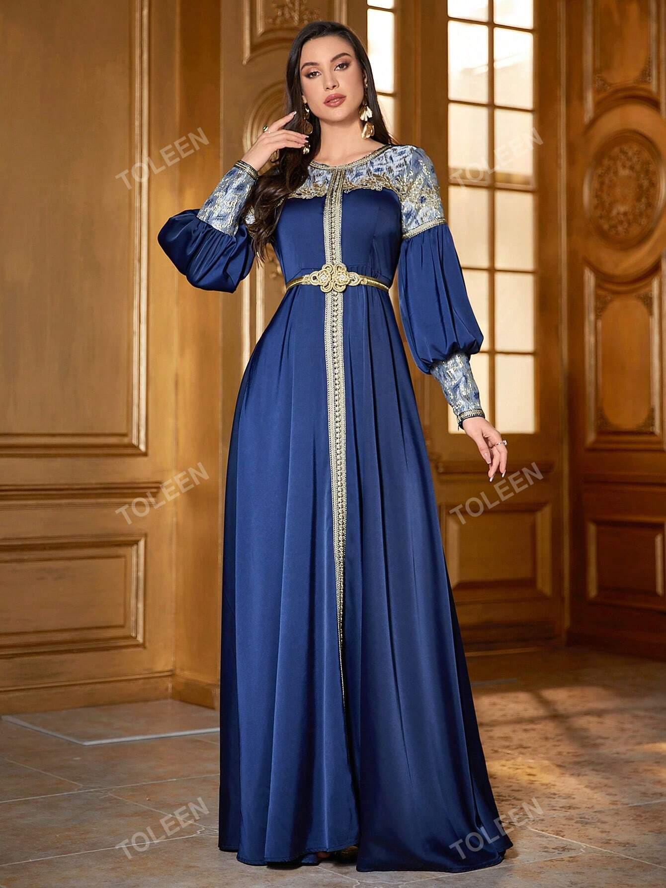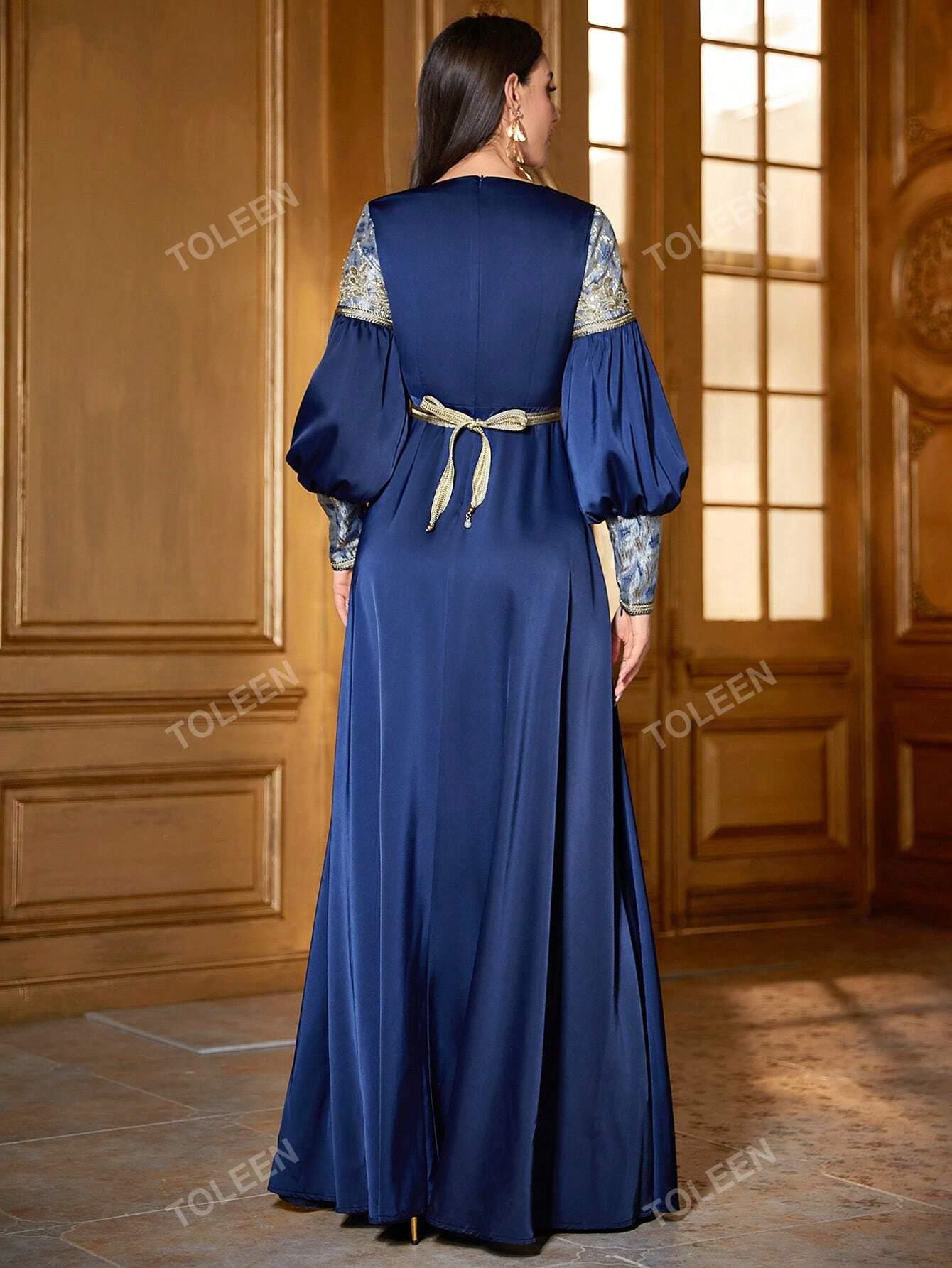 Type : A LineDetails : Appliques, Belted, ZipperSleeve Type : Bishop SleeveStyle : ElegantNeckline : Round NeckColor : BluePattern Type : ColorblockSleeve Length : Long SleeveLength : LongFit Type : Regular FitFabric : Non-StretchMaterial : Woven FabricComposition : 100% PolyesterCare Instructions : Hand wash,do not dry cleanSheer : No