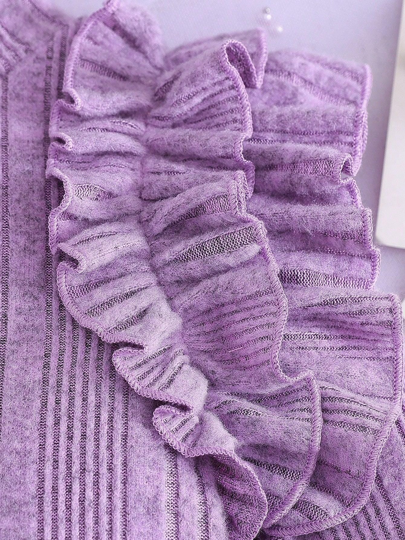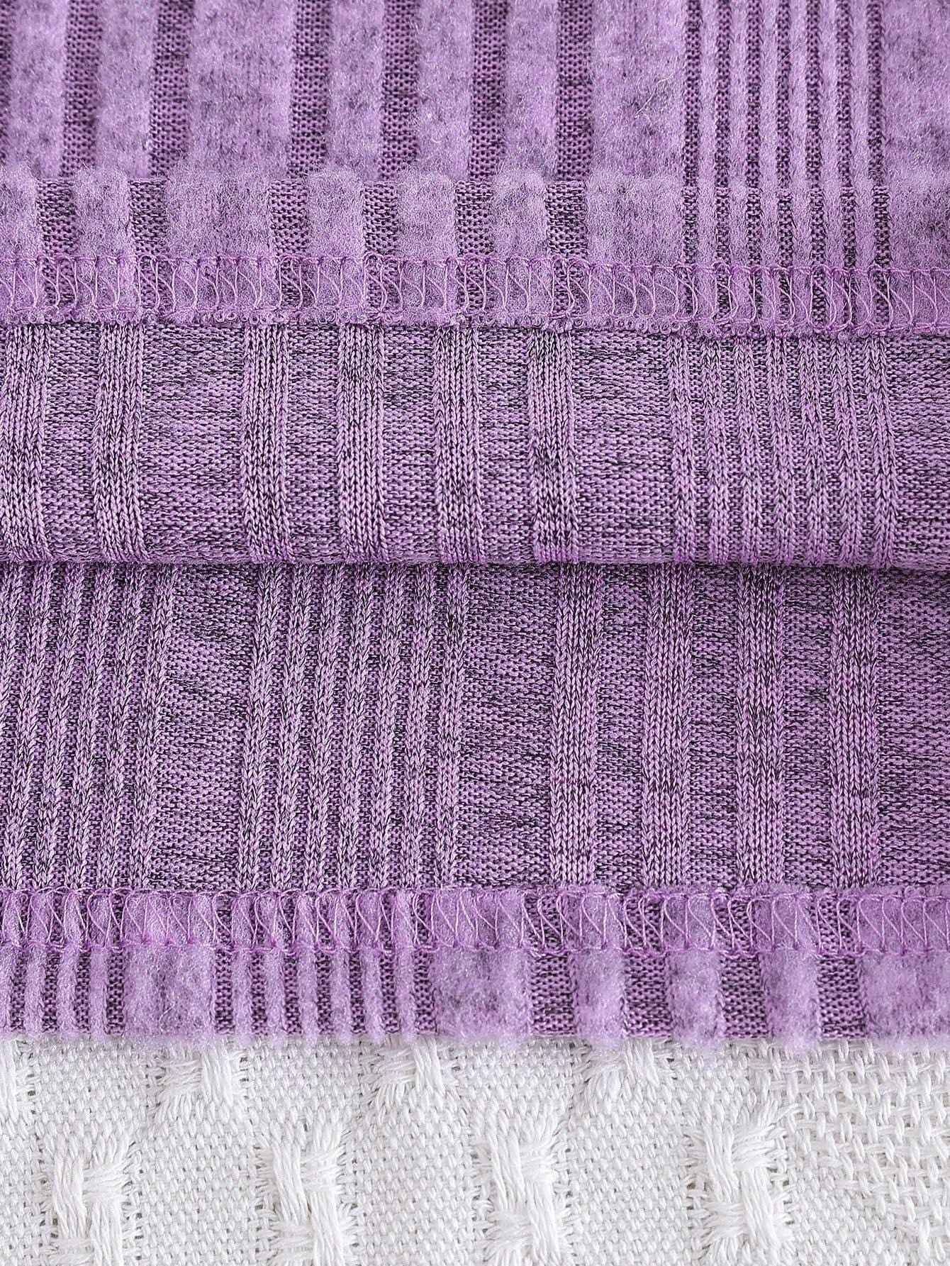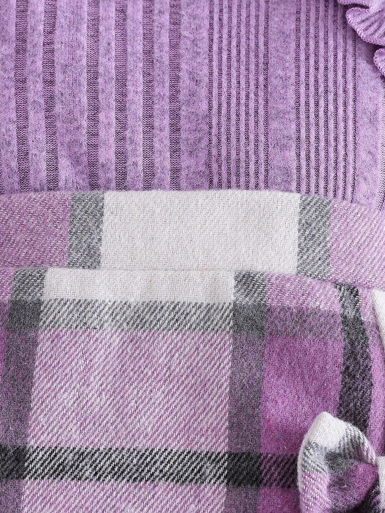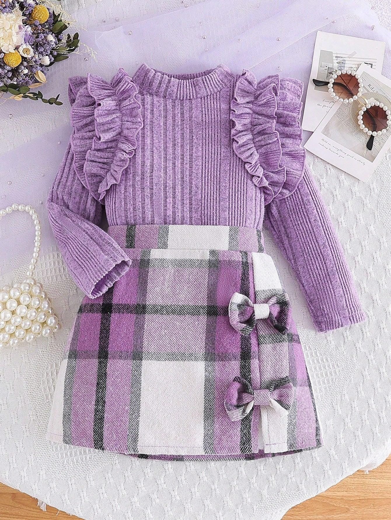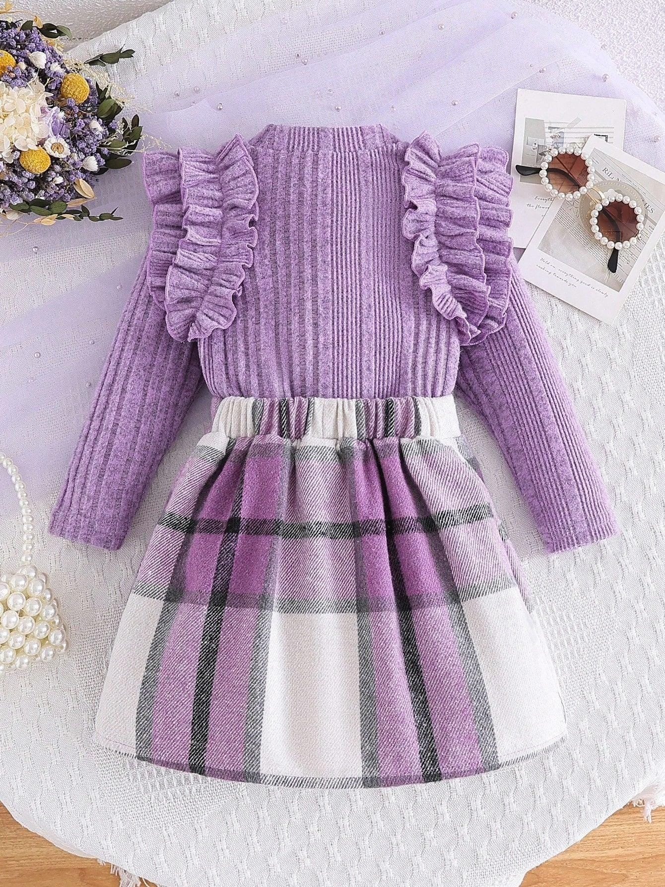 Young Girl New Autumn And Winter Fashion Suit, Solid Color, Cap Sleeves, Half High Collar, Ribbed Pullover & Asymmetrical Plaid Skirt,